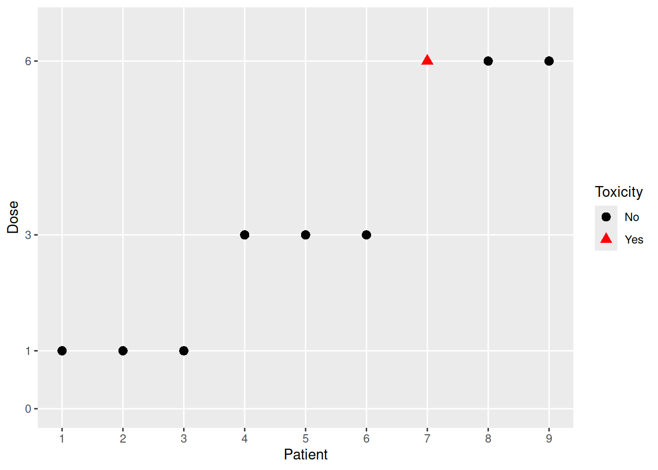 We see that 3 patients each were treated sequentially at the dose levels 1, 3, and 6, with one dose-limiting toxicity (DLT) observed at dose level 6. Dose escalation designs answer the question of which dose to recommend for the next cohort of patients based on the observed data, and how to estimate the maximum tolerated dose (MTD) at the end of the trial.