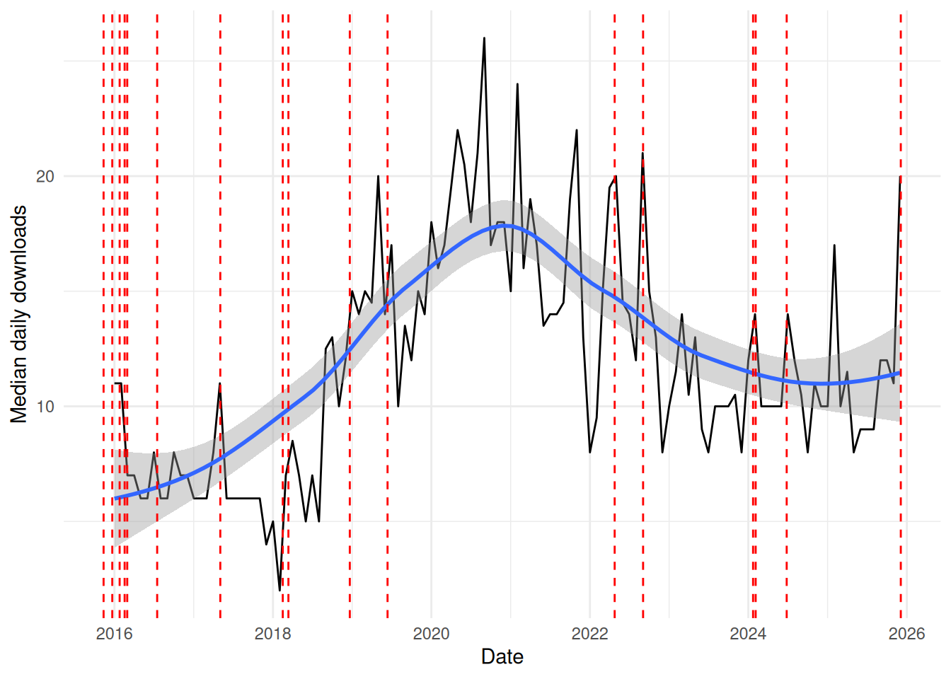 The following chart shows the median daily downloads of crmPack from CRAN each month since 2016: