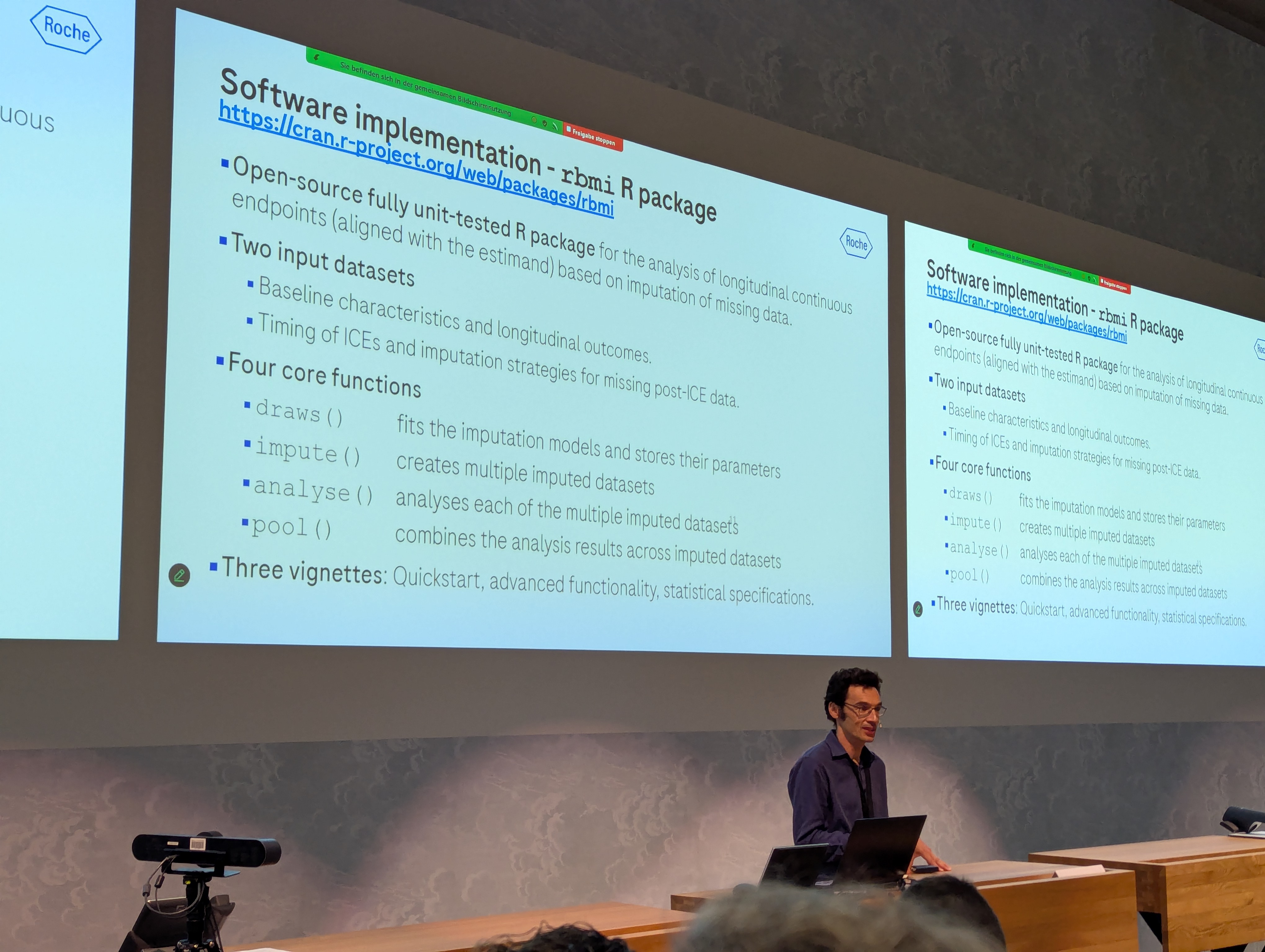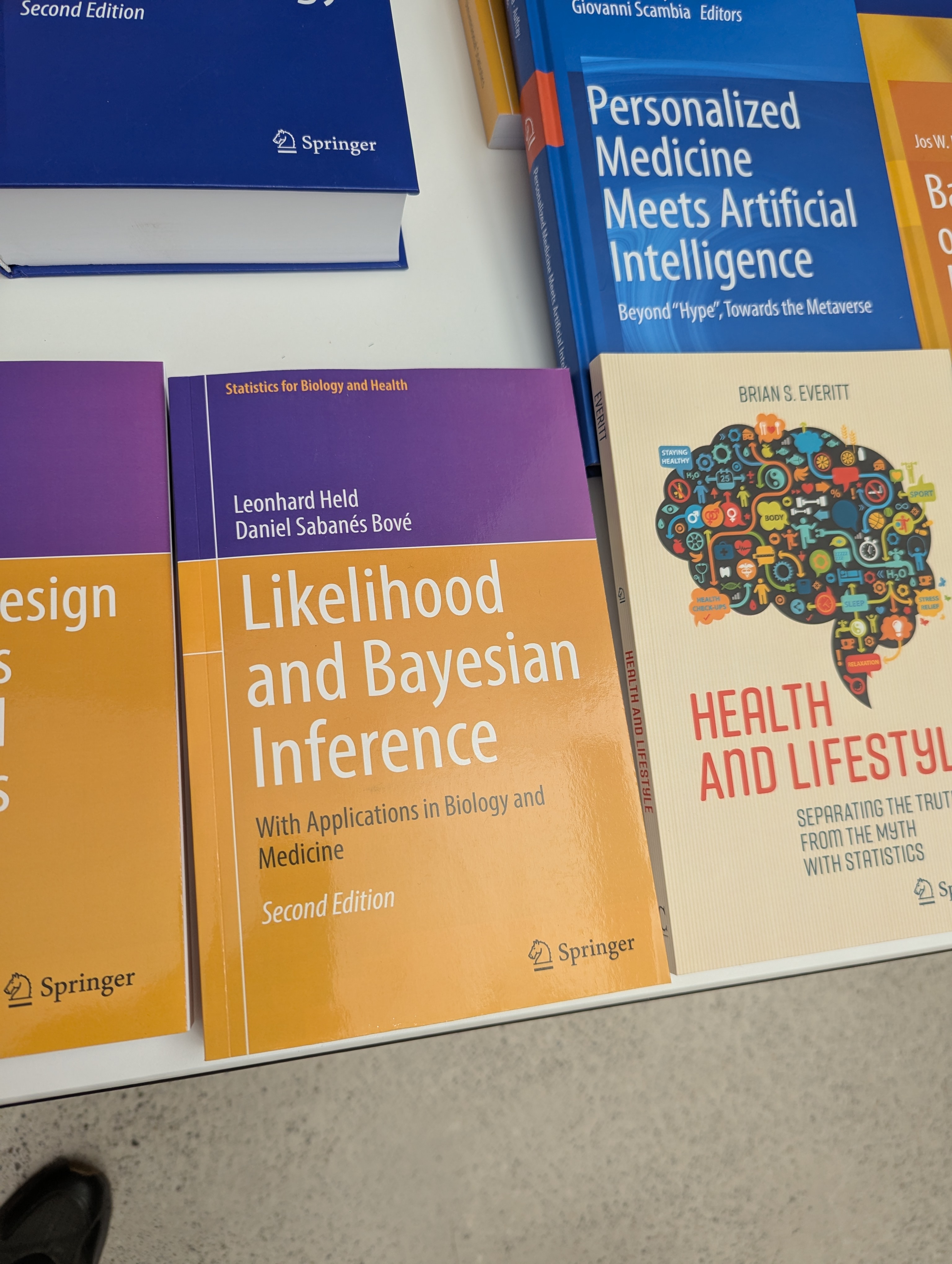 Lots of posters were presented, and I was one of the presenters - I shared an overview of the R packages rpact and crmPack for clinical trial design in R (see the poster here). It was a bit unfortunate that the food was far away from the posters, and there was no dedicated poster session. Therefore I did not get too many poster viewers. However it was fun to have a raffle to win a first edition copy of our “Likelihood and Bayesian inference” book - finally a good use of the book that just stood in my shelf for the last years! Plus it was nice to see that Eva Hiripi from Springer had our second edition on offer at the Springer booth.