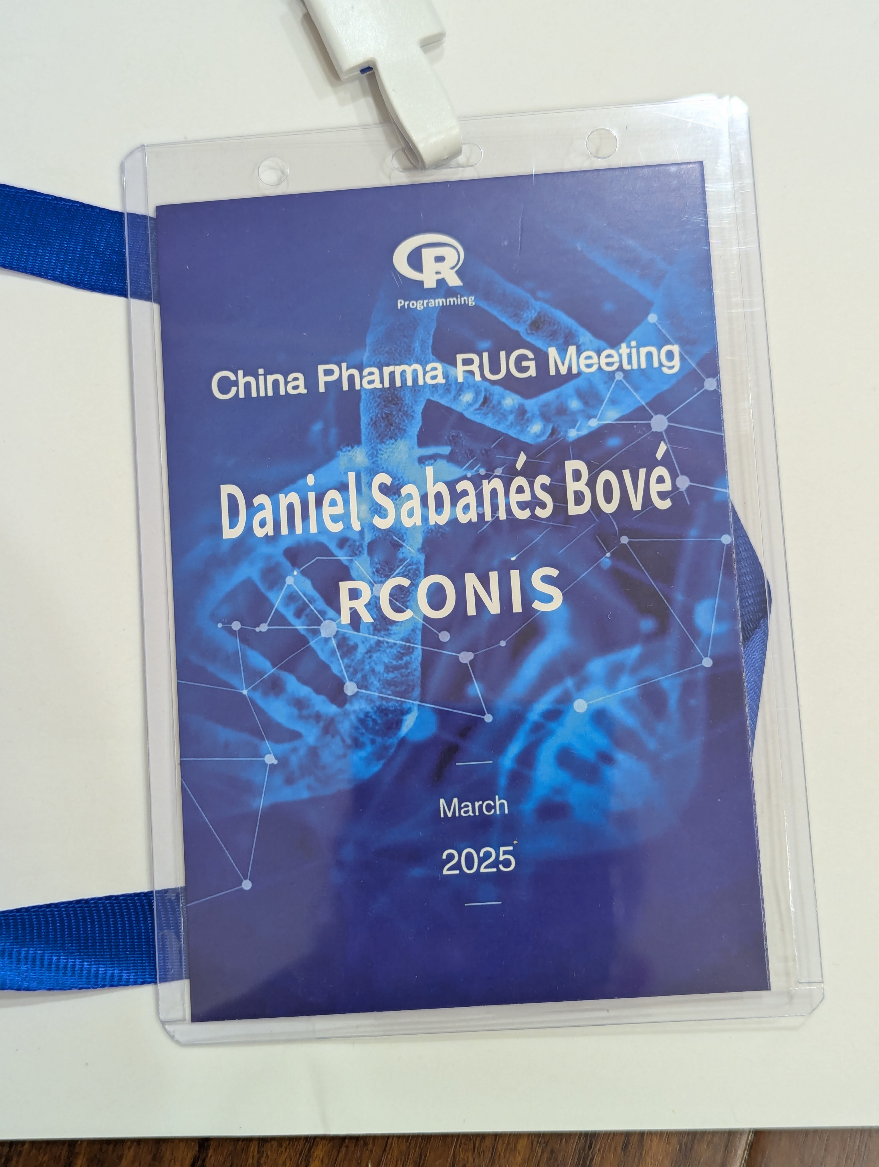 I presented “Designing Clinical Trials in R with rpact and crmPack” and the slides are available here and the recording here. Despite being the last presentation of the day (so participants were maybe a bit tired and looking forward to the dinner already) and being the only presentation in English (all others were in Chinese), the audience was well engaged and I got a few questions (and I could even use my broken Chinese a little bit at the end, but it is not captured in the recording 😆). My main objectives were to raise awareness about the open source R packages rpact and crmPack. Plus it was a great opportunity to distribute hex stickers of the two package logos, as well as RCONIS stickers, too!
