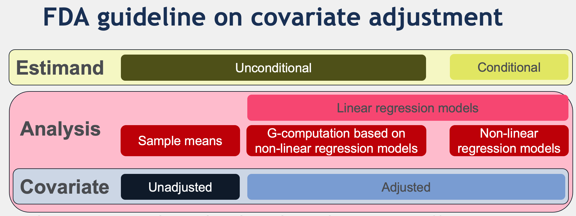 Another important aspect is that covariate adjustment methods must not be confused with the choice of unconditional or conditional treatment effect estimands. Covariate adjustment is a technique that can be applied to estimate either type of estimand, i.e., it provides estimators, not estimands.